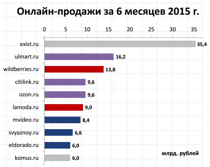 У ритейлера Lamoda за год (с третьего квартала 2014 по третий квартал 2015 годов) доля заказов с планшетов и смартфонов увеличилась в три раза и достигла 36% (3,9 млрд рублей). KupiVip заявил о росте на 40%, не раскрыв доли в мобильных продаж в общем обороте. В "М.Видео" доля мобильных продаж увеличилась на 40%, что принесло компании 38% (или 7,8 млрд рублей с НДС) всех интернет-продаж сети. В "Юлмарте" рост не оценивали, но согласно отчетности компании в 2015 году 12,8% всего оборота пришлось на мобильный канал.