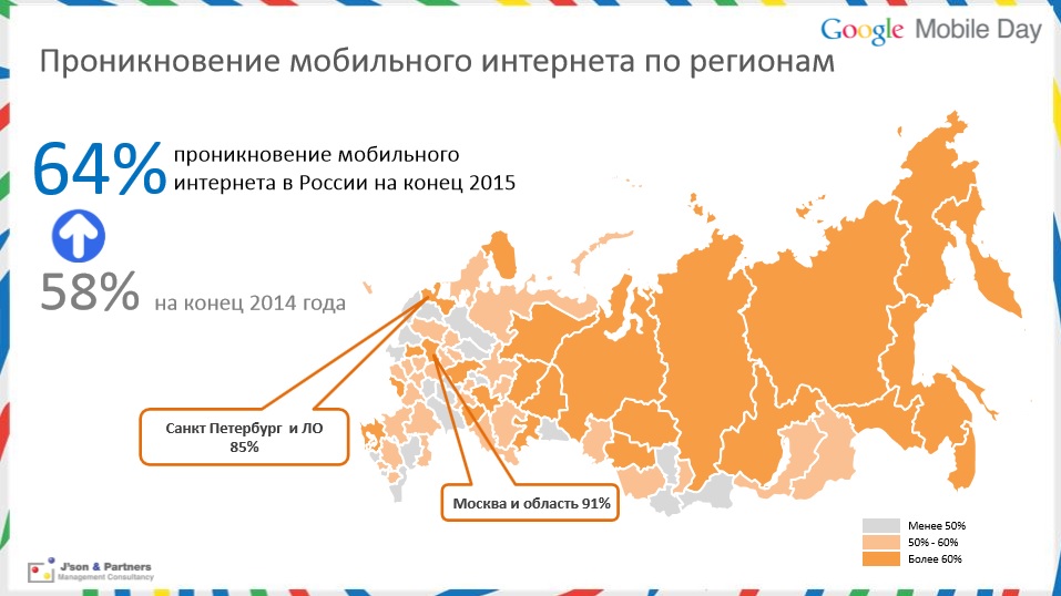 Рост 3G / LTE даёт мощный толчок к мобильным продажам в стране. По данным J’son & Partners Consulting, в 2015 году уровень проникновения мобильного Интернета в России достиг отметки 64%, а через пять лет ожидается, что он превысит 85%. На сегодняшний день в России насчитывается около 52 млн мобильных пользователей. В J&P Consulting считают, что к 2018 году трафик с мобильных устройств увеличится в 2,6 раза в сравнении с 2015 годом.