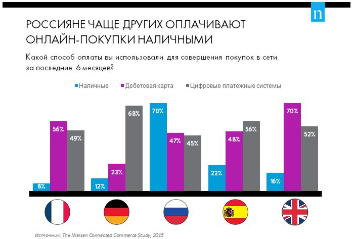 По данным Nielsen, 70% российских интернет-покупателей предпочитает оплачивать заказы наличными курьеру при получении. По этому показателю наша страна находится на третьем месте после Нигерии (76%) и Филиппин (73%).
