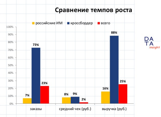 Россияне стали все чаще покупать товары в зарубежных интернет-магазинах. За 2015 год число онлайн-заказов за рубежом выросло на 75-80% согласно оценкам практически всех аналитиков рынка (АКИТ, Data Insight, EWDN и НАДТ). При этом, в денежном выражении объем трансграничного сегмента онлайн-торговли вырос совсем не так значительно. В Data Insight утверждают, что прирост в денежном выражении составил 28%, в АКИТ — 5% (такое расхождение может объясняться различием в курсах валют, в Data Insight оперировали суммами в рублях). Все эксперты отмечают незначительный прирост среднего чека в зарубежных интернет-магазинах.