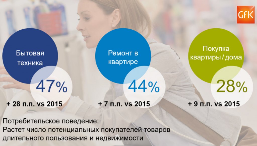 Стоит понимать, что, так или иначе, далеко не все эти люди побегут в интернет-магазины покупать мебель или обои, всё зависит от множества факторов, в том числе, и финансового состояния населения и наличия походящего предложения. Однако, полагают в GfK, судя по тому, как растет потребительский оптимизм в этом году, россияне готовы к крупным покупкам.