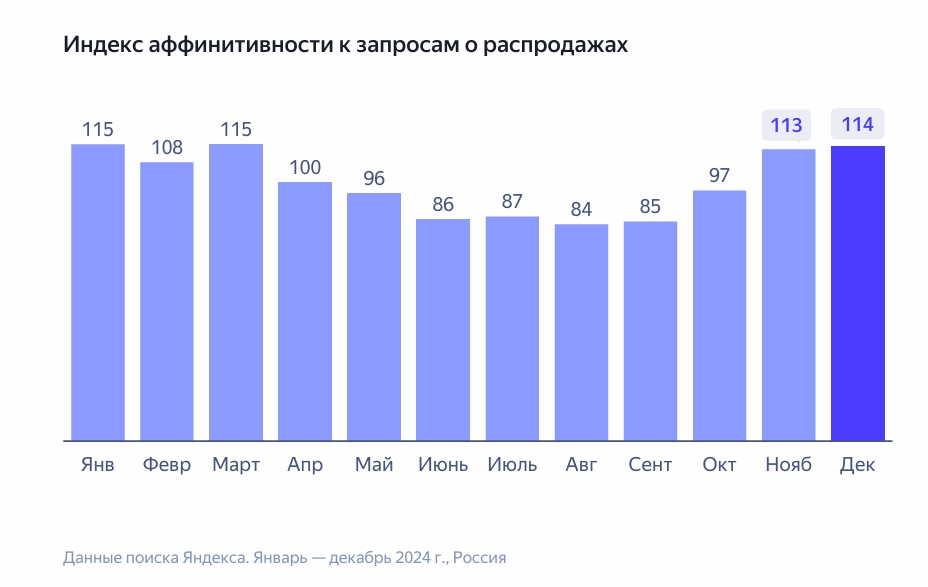 Интерес к скидкам растет задолго до самой акции. Уже с середины октября пользователи начинают искать выгодные предложения, и пик запросов приходится на вторую половину ноября. В прошлом году россияне сделали 222 млн поисковых запросов, связанных с распродажами.