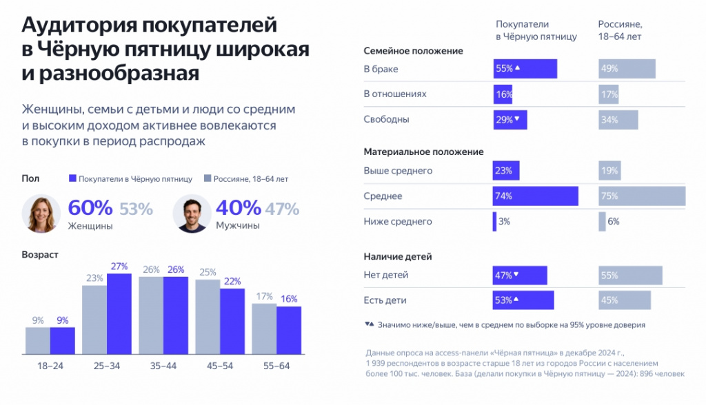 При этом 61% опрошенных не знают точную дату Черной пятницы, хотя 89% слышали о ней. Половина покупателей узнают о распродаже из рекламы. В ноябре бренды увеличивают медийные бюджеты на 20% и расходы на performance-рекламу на 18%.