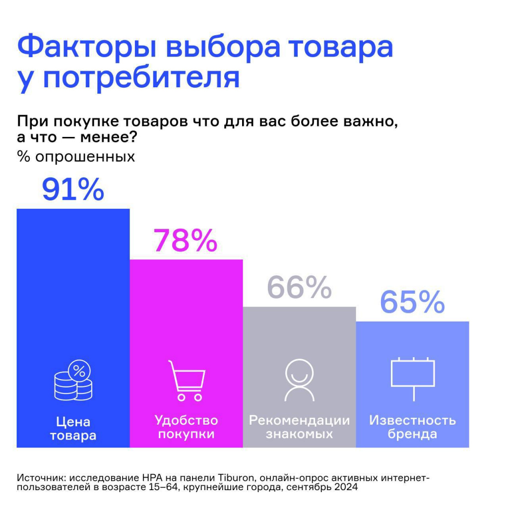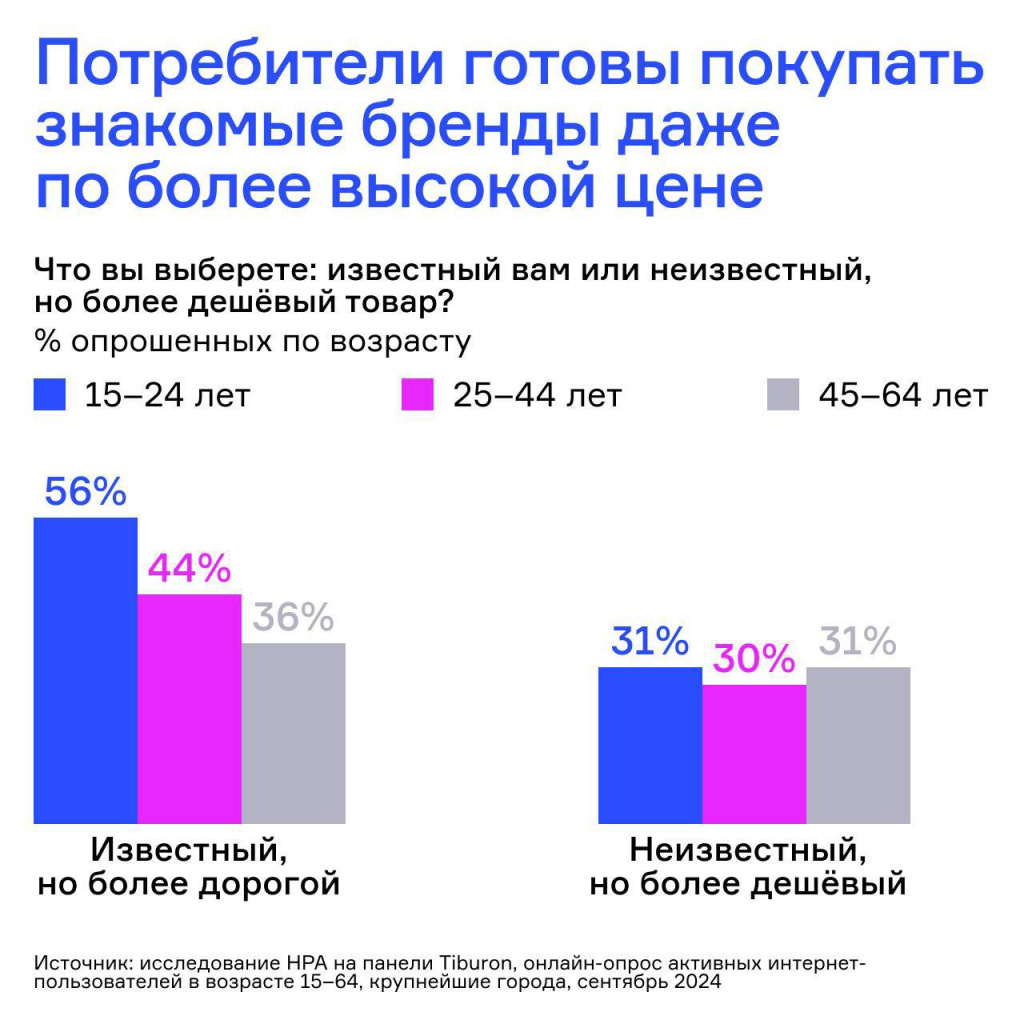 По данным аналитиков Национального рейтингового агентства (НРА), 43% аудитории готовы платить больше за известный для себя бренд. При этом потребители всё ещё при выборе товара в первую очередь обращают внимание на цену — так ответили 91% респондентов.