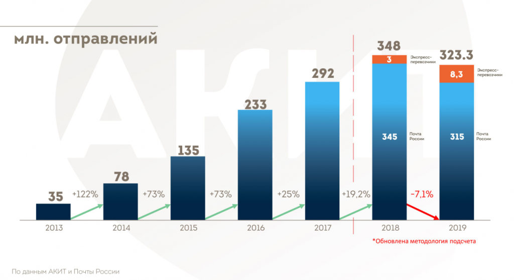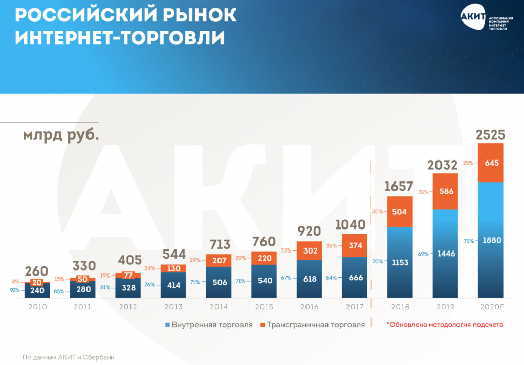 В 2018 году АКИТ поменяла методологию исследования. У ассоциации появились новые партнеры в лице Сбербанка, OFD.ru, Admitad, что позволило использовать новые источники данных и новые способы подсчета.