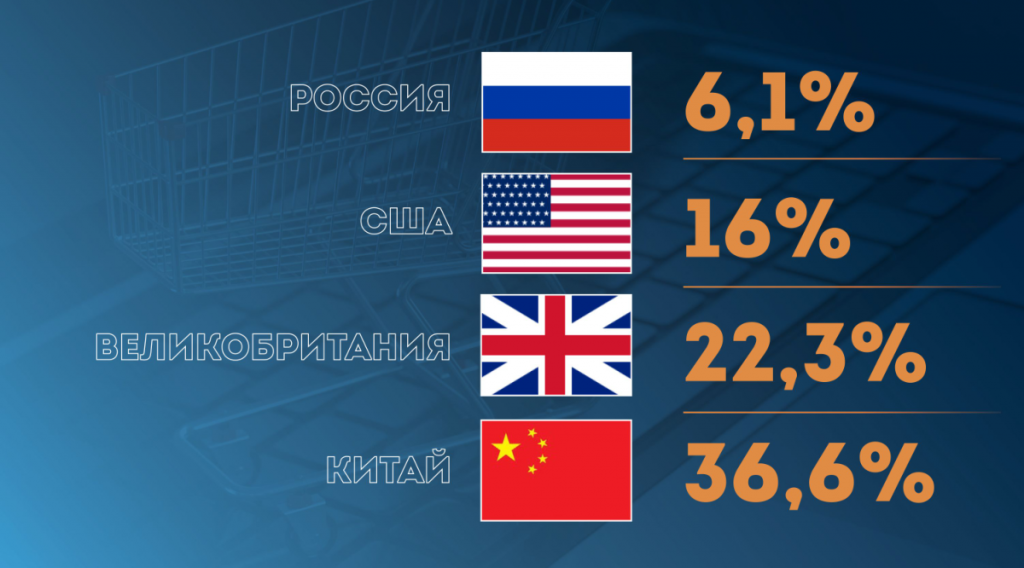 Доля eCommerce в общем розничном обороте составляет 6,1%. Это существенный рост. В прошлом году она была 5,3%. Для сравнения: в Китае этот показатель равен 36,6%.