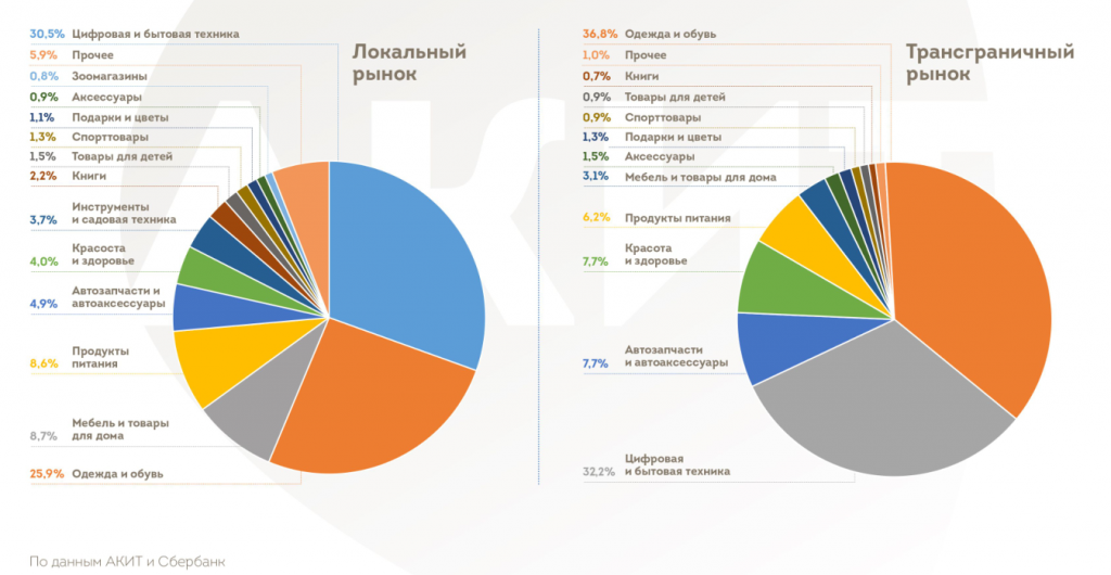 В 2019 году россияне стали чаще заказывать одежду и обувь по интернету. Если в прошлом году эта категория занимала 33% (в деньгах) всего рынка трансграничных покупок, то в этом году уже 36,8%. На локальном рынке доля категории выросла с 23 до 25,9%. Вице-президент Ассоциации компаний интернет-торговли Лия Левинбук полагает, что это связано с тем, что за год маркетплейсы развили сервисы, подключили к ним новых поставщиков и таким образом расширили ассортимент в данной категории.