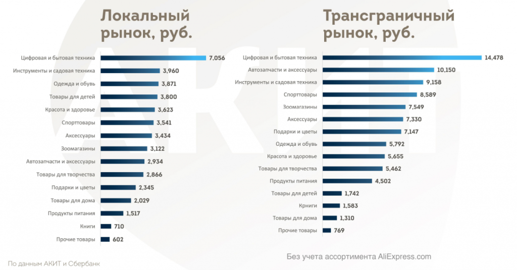 В АКИТ не дают единого среднего чека покупок в интернет-магазинах. Данные же по категориям за год существенно изменились.