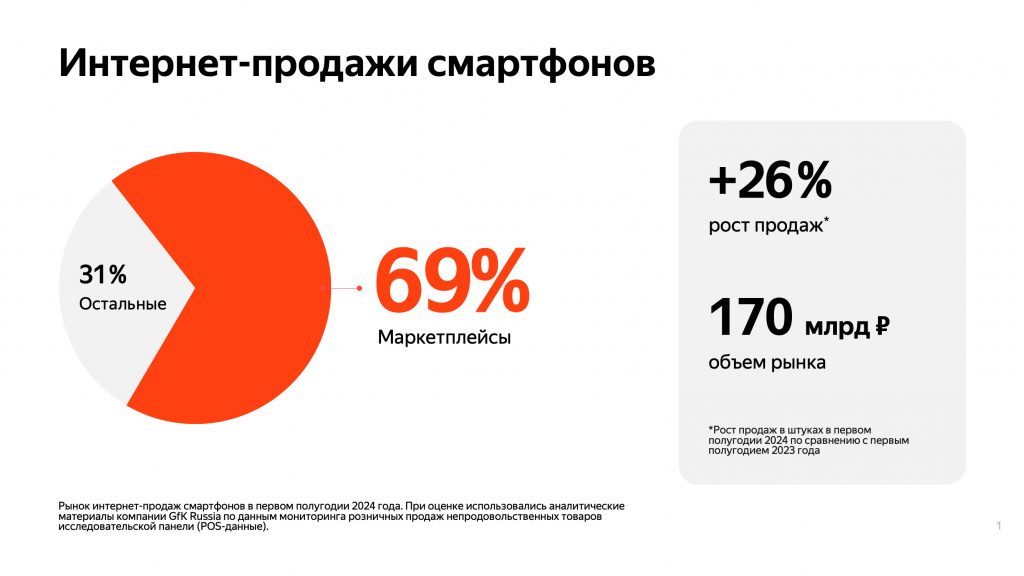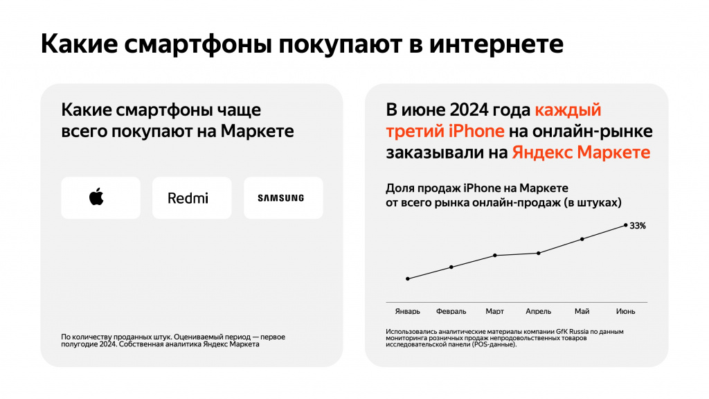 Среди наиболее популярных брендов на Яндекс Маркете в первом полугодии 2024 года оказались Apple, Redmi и Samsung. При этом Apple демонстрирует наиболее высокие темпы роста продаж. По оценкам аналитиков маркетплейса, каждый третий iPhone, проданный в России в июне 2024 года, был приобретен именно на этой площадке.