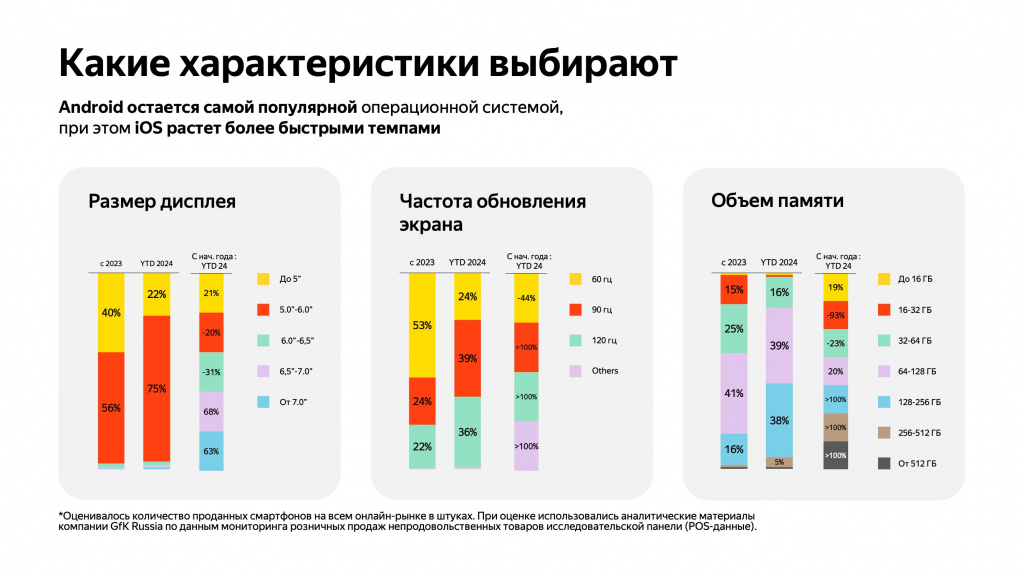 Параллельно с этим, покупатели все чаще отдают предпочтение смартфонам с большими экранами. Доля смартфонов с диагональю от 6,5 до 7 дюймов увеличилась с 56% до 75%. Также наблюдается рост спроса на устройства с высокой частотой обновления экрана (90 Гц и 120 Гц) и большим объемом внутренней памяти. Примечательно, что число проданных смартфонов с внутренней памятью от 128 гигабайт и более увеличилось более чем в два раза по сравнению с прошлым годом.