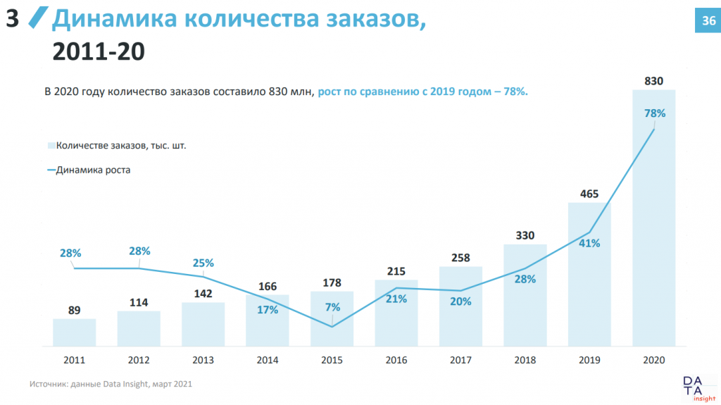 По оценке Data Insight, только за три квартала 2020 был доставлен 601 млн отправлений. Это на 27% больше, чем в 2019 году целиком. Разница с первыми тремя кварталами 2019 года составляет 82%.