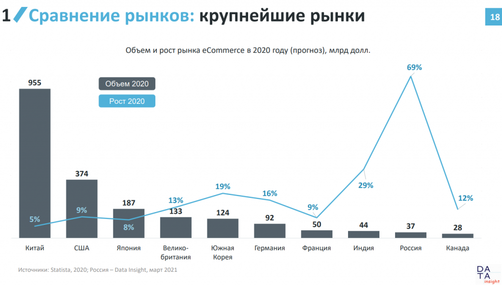 Российский рынок eCommerce в 2020 году продемонстрировал рекордный рост на 69%. Для сравнения: рынок США вырос на 9%, а Китая - на 5%.