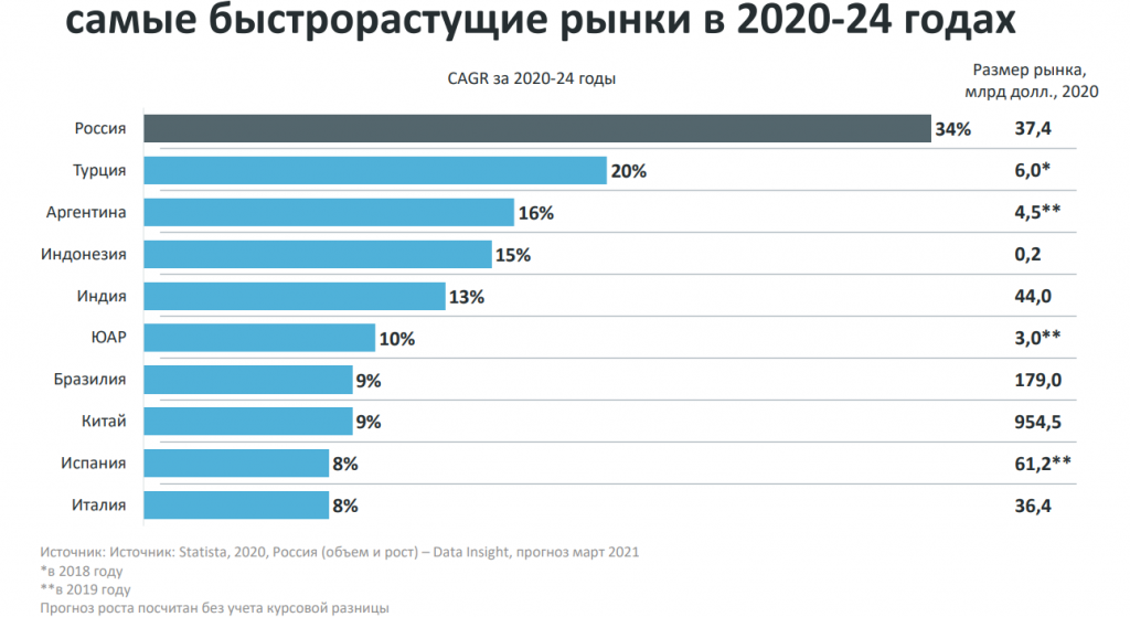 Важный момент: Эксперты уточняют, что не следует сравнивать объёмы рынка 2019 и 2020 годов, так как за это время появились сектора, которые не учитывались в данных по объему рынка за 2019 год, например, рынок продаж продуктов питания. Поэтому прямое сравнение с 2019 годом будет некорректным.