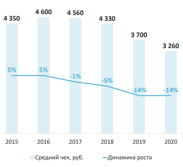К 2025 году средний чек продолжит уменьшаться и выйдет на плато в 2260 рублей.