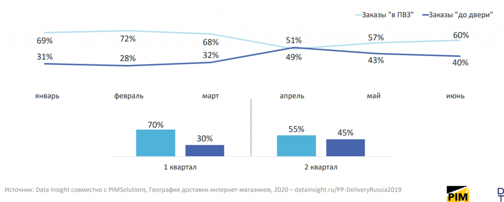 2020 год серьёзно поменял структуру логистики. В первом квартале 2020 года доли заказов «в ПВЗ» и «до двери» были на уровне 2019 года, но в апреле — в связи с самоизоляцией — доля заказов, оформленных на дом, превысила долю заказов в ПВЗ.