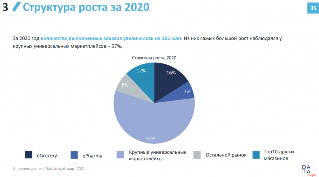 Лидером роста в 2020 году стал рынок eGrocery (включает все продажи специализированных интернет-магазинов и сервисов доставки продуктов питания). Суммарно он вырос на 250% (в деньгах) и составил 130 млрд рублей (69 млн заказов).