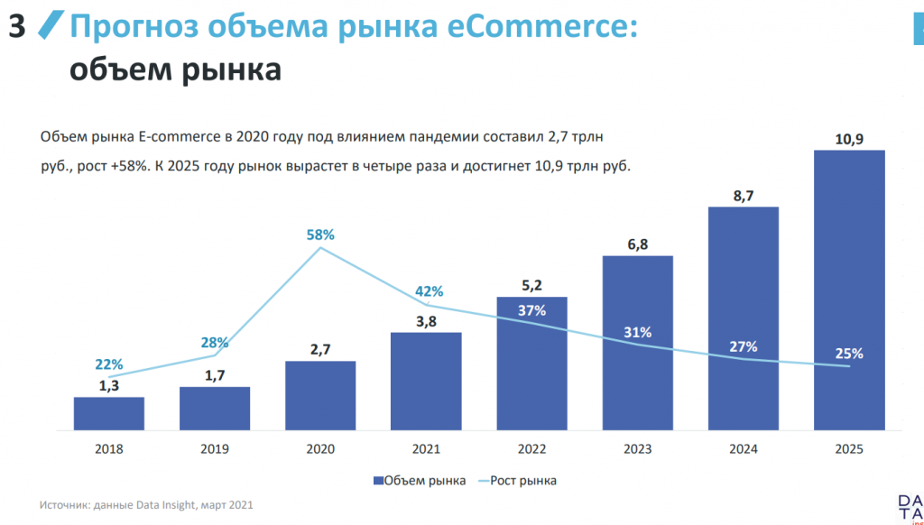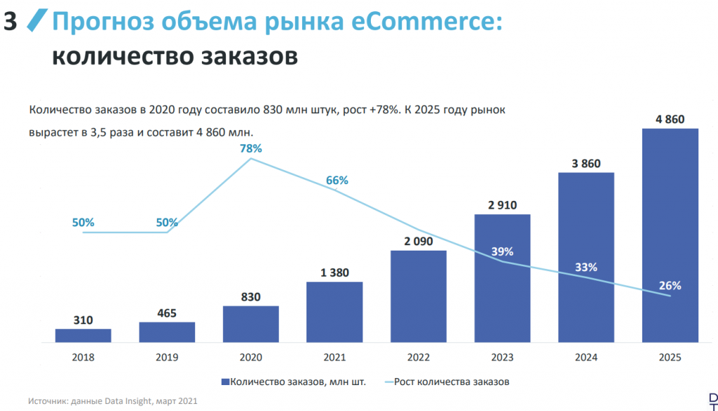 К 2025 году рынок вырастет в четыре раза и достигнет 10,9 трлн рублей, считают в Data Insight. При этом число заказов вырастет в 3,5 раза и составит 4 860 млн.