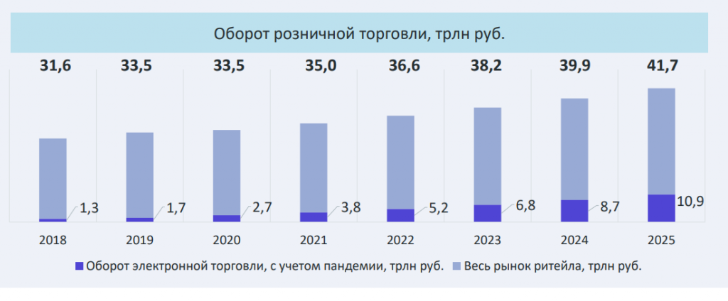 Доля электронной торговли в розничной будет расти с каждым годом: в 2020 году она равна 21%, а в 2025 году будет равна 26%.