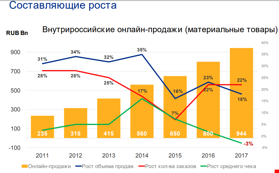 Внутрироссийские онлайн-продажи в 2017 году составили 945 млрд. Онлайн-продажи за год выросли на 18% в денежном выражении, а число заказов в интернет-магазинах увеличилось на 22% (учитывались только материальные товары).