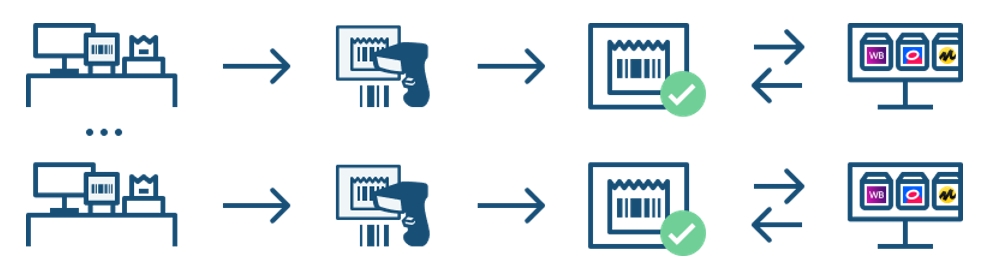 Подключив сканер и принтер этикеток к 1С, можно упаковывать заказы просто сканируя штрихкод выбранного товара, а система автоматически подберет нужный заказ, а также получит и распечатает этикетку с площадки. Этот режим в разы ускоряет процесс упаковки товаров на складе. Если заказов много, то можно построить сразу несколько линий параллельно.