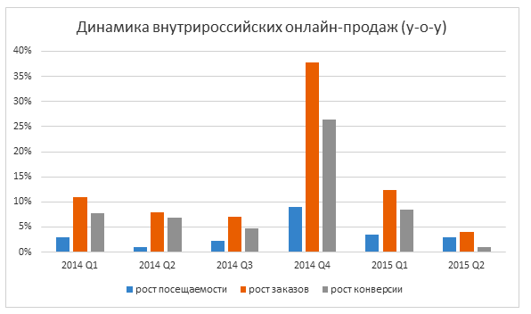 На 3-4% в год растет и посещаемость интернет-магазинов. Средний уровень конверсии трафика в заказы практически не изменился по сравнению с весной-летом 2014 г.