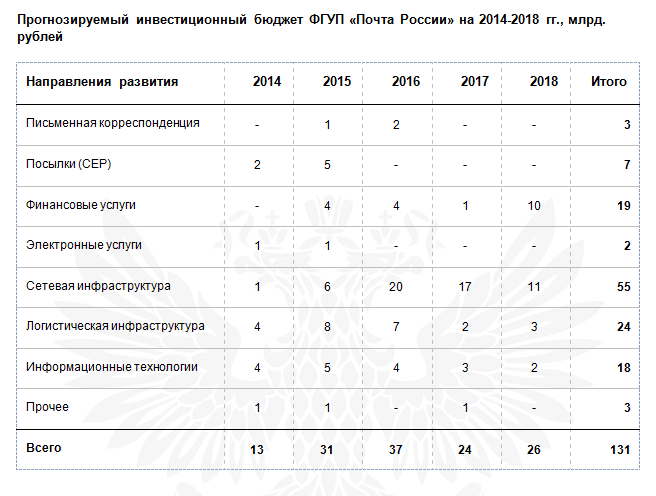 Инвестиции будут направлены на реализацию основных положений стратегии развития Почты России, при этом в планы, изложенные в Стратегии развития ФГУП Почта России на период до 2018 года (см. таблицы ниже), внесли некоторые изменения.