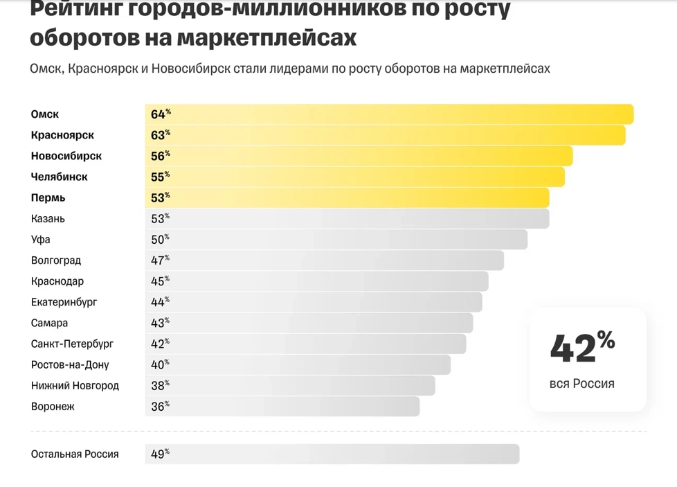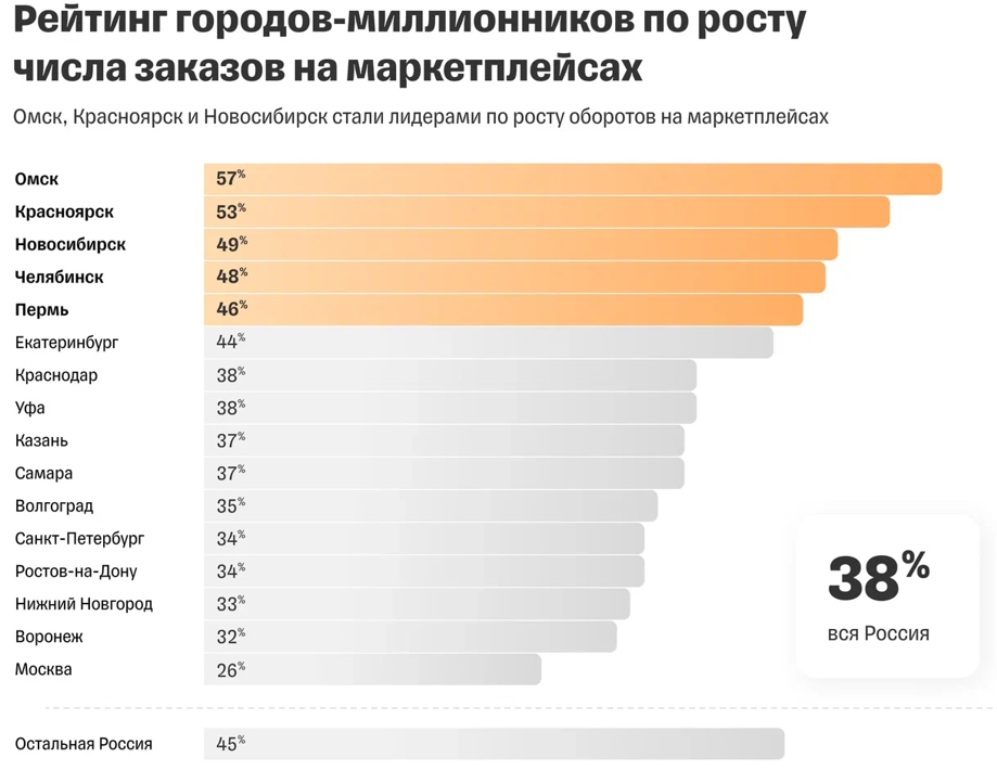 Количество заказов на маркетплейсах также увеличилось во всех городах-миллионниках - средний рост по России составил 38%.