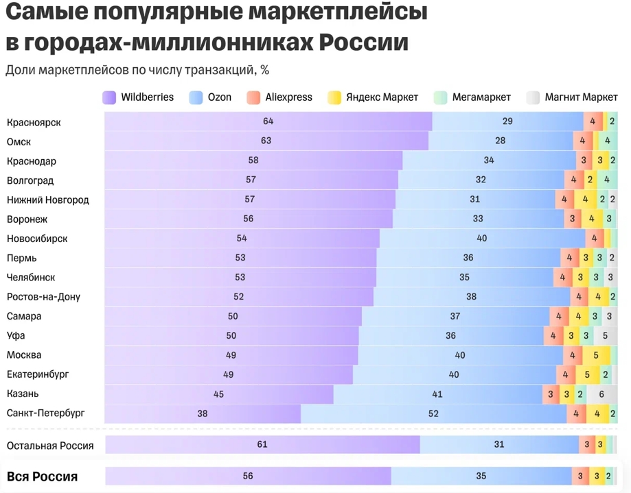 В исследовании была также проанализирована популярность шести универсальных маркетплейсов в городах-миллионниках. Почти во всех регионах более половины покупок на маркетплейсах совершаются на Wildberries, за исключением четырех городов - Москвы, Екатеринбурга, Казани и Санкт-Петербурга. В последнем Wildberries уступил первенство Ozon, на который приходится 52% заказов на маркетплейсах.