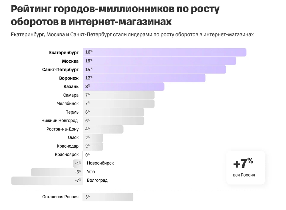 Что касается интернет-магазинов, за последний год они показали рост оборотов на 7% в среднем по России. Почти во всех городах-миллионниках, за исключением четырех, динамика была положительной - от +2% до +16%.