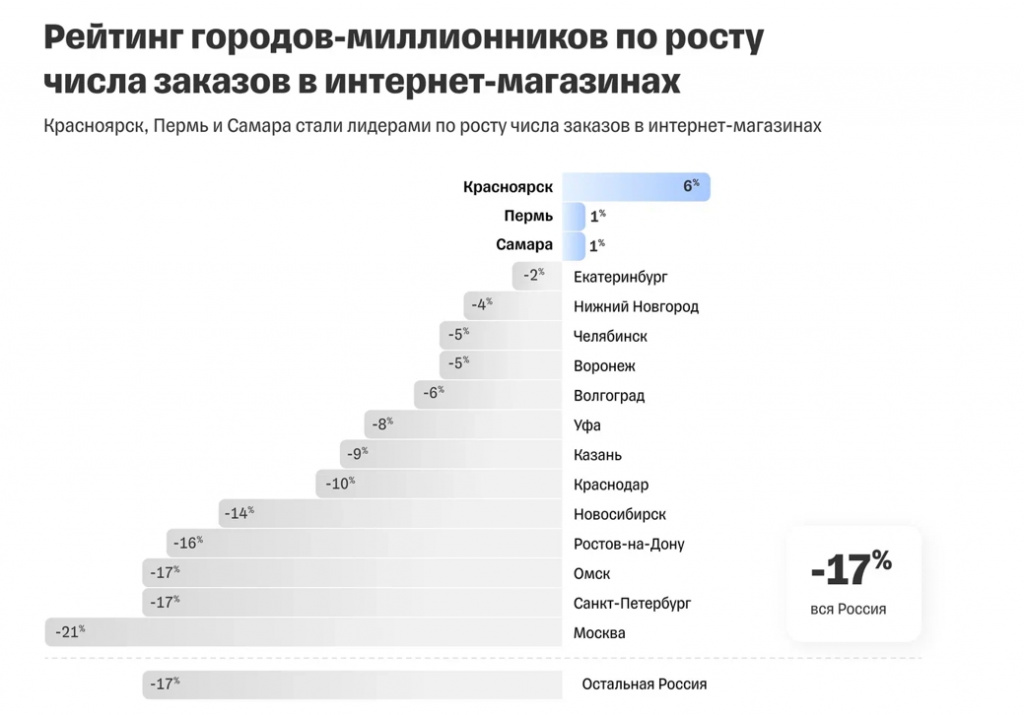 Если говорить о числе транзакций, оно выросло только в трех регионах - Красноярске (+6%), Перми (+1%) и Самаре (+1%). В остальных регионах этот показатель уменьшился, а в среднем по России число оплат в интернет-магазинах сократилось на 17%.