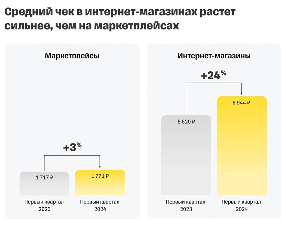 По его словам, средний чек за онлайн-заказ вырос в интернет-магазинах (+24%), и на маркетплейсах (+3%). Это говорит о том, что покупательский спрос в регионах вернулся на уровень, когда люди готовы тратить больше на онлайн-шопинг и не боятся делать дорогостоящие покупки.