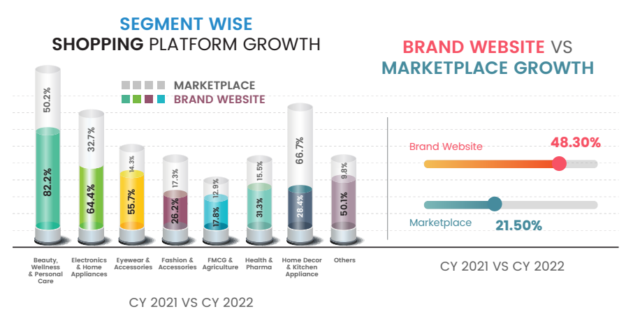 Бренды D2C наращивают свое присутствие в сфере электронной коммерции. Объем заказов через D2C сайты брендов в 2022 году вырос на 48,3%, в то время как на маркетплейсах только на 21,5%. Показательным является Сегмент красоты и личной гигиены, который вырос на 82,2% на брендовых веб-сайтах и всего на 50,2% на маркетплейсах.