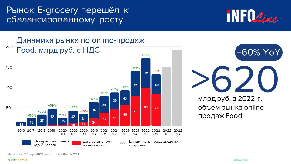 Еще в середине сентября аналитики предвидели годовой рост eGrocery, превышающий 70%, однако с учетом эффекта от мобилизации и всплеска эмиграции эти прогнозы пересмотрели: рост online-продаж продовольственных товаров в 2022 году не превысит 60%, а объем рынка составит не более 620 млрд рублей, убеждён Бурмистров.