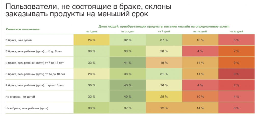 Также срок, на который пользователи заказывают продукты, зависит от их семейного положения. Люди, которые состоят в браке, но не имеют детей, чаще всего покупают товары на 7 дней. Продукты на 2-3 дня чаще всего заказывают пользователи в браке и с детьми или те, кто не состоит в браке и не имеет детей. На 1 день продукты чаще всего покупают люди не в браке, но с детьми.