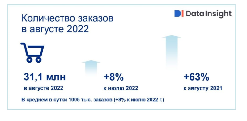 Интернет-магазины продуктов питания в августе выполнили 31,1 млн заказов, что на 8% больше, чем в июле 2022 года, и в 1,6 раз больше, чем в августе 2021 года, сообщают эксперты Data Insight.