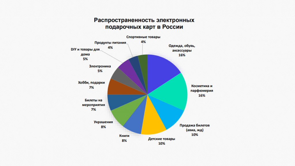 В целом, в российском ритейле в настоящий момент электронные подарочные карты чаще всего представлены в интернет-магазинах по продаже одежды, обуви и аксессуаров (16%); косметики (16%); детских товаров (10%), а также среди сервисов по продаже авиа/жд билетов (10%).