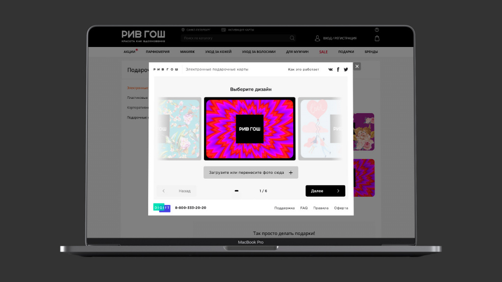 Электронную подарочную карту «Рив Гош» легко найти на сайте – ссылка на покупку размещена на главной странице сайта до скролла, в том числе в мобильной версии сайта и в приложении. Сервис имеет расширенные возможности для покупателя и получателя, например, возможность загрузки фото, праздничное получение подарка в виде анимированного конверта, мгновенная активация, применение на кассе с экрана смартфона.