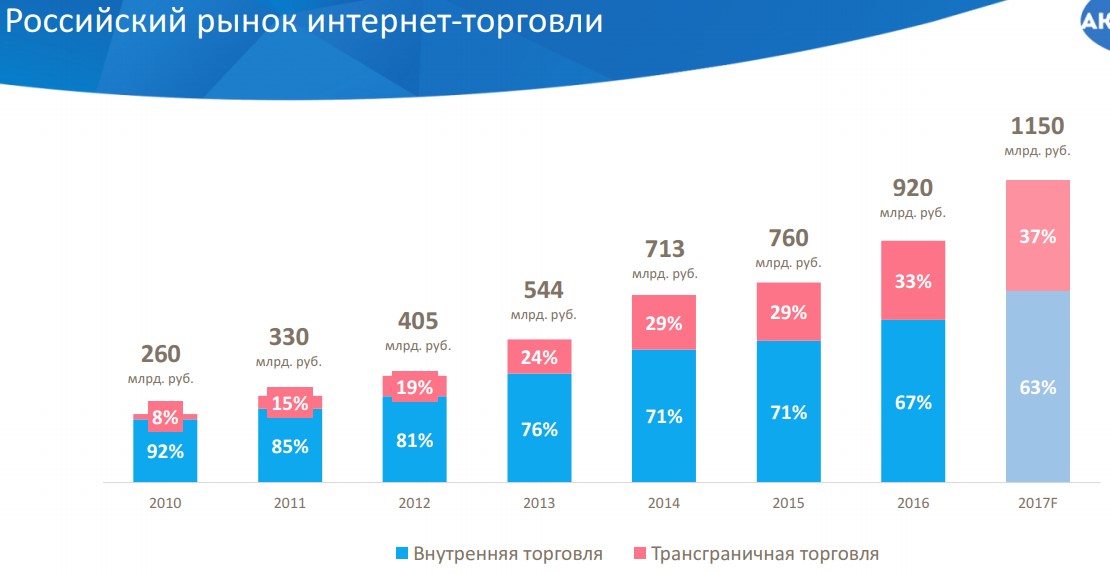 Объем трансграничной торговли составил за первое полугодие 178 млрд рублей, а всего за год будет около 420 млрд. Это на 34% больше, чем годом раньше. Для сравнения: в 2016 году объем рынка трансграничной торговли увеличился на 37% и составил 301,8 млрд рублей.