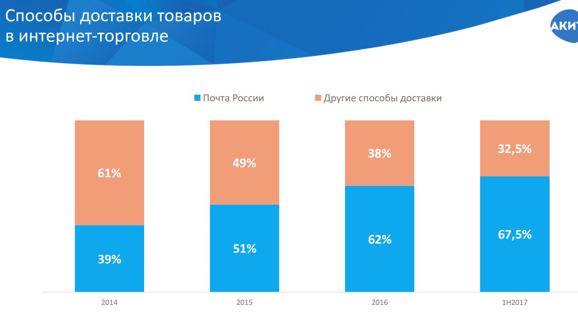 По данным АКИТ, именно через "Почту России" идёт 67,5% от всех товаров в российской интернет-торговле. На днях стало известно, что выручка оператора от продажи товаров, продукции, работ и услуг в первом полугодии 2017 года увеличилась на 6,1% и составила 80,848 миллиарда рублей. Компания объясняет это, в частности, увеличением объемов входящих международных почтовых отправлений.