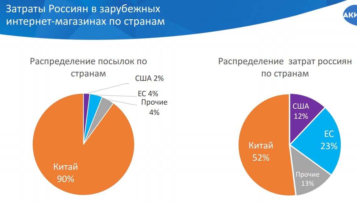 Если оценивать поток входящих посылок, то 90% из них приходит из Китая, при этом на закупки там тратится всего 52% средств. Как следует из опроса банка «Хоум Кредит», во втором полугодии 2017 года около 88% зарубежных покупок совершалось в Китае.