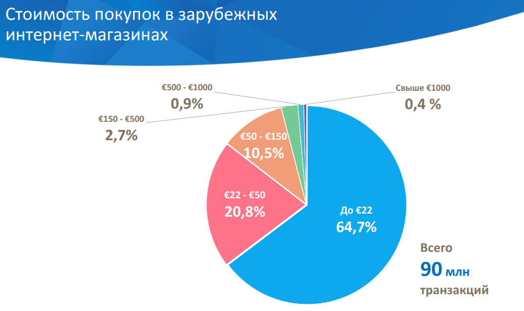 Стоимость посылки при кроссбордерной торговле чаще всего (в 64,7% случаях) составляет до 22 евро. Впрочем, тут разные эксперты расходятся во мнениях. В частности, по данным Промсвязьбанка, средний чек покупок в зарубежных интернет-магазинах за январь-июль увеличился с 1429 до 1722 рублей. А глава Национальной ассоциации дистанционной торговли (НАДТ) Александр Иванов ранее заявлял, что средний чек россиян при покупке за рубежом неуклонно снижается несколько лет подряд. В первом квартале 2017 года он «преодолел психологически важную отметку в $10 за покупку и упал до 9 долларов».
