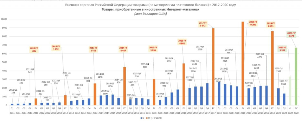 Аналитик Алексей Петровский свёл воедино данные по закупкам россиян в иностранных интернет-магазинах. Источник данных - Банк России, аналитика внешней торговли товарами по методологии платежного баланса.