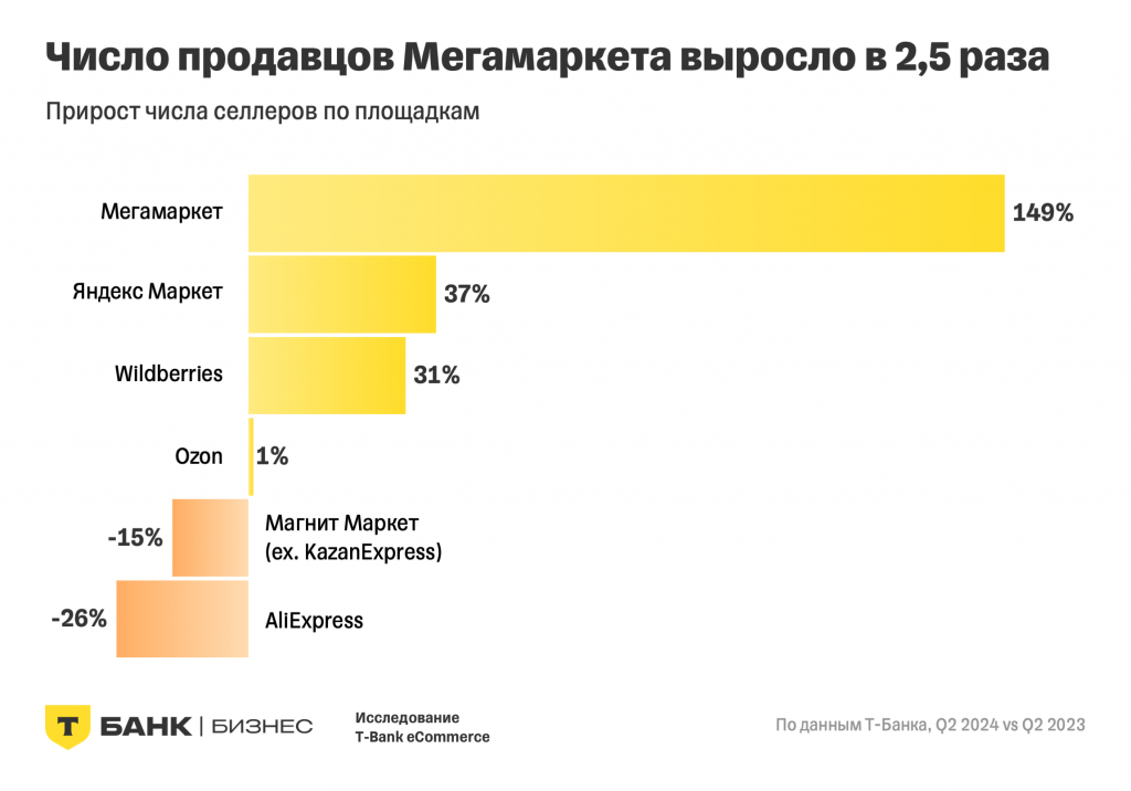 Максимальный рост продемонстрировал Мегамаркет, где число продавцов увеличилось в 2,5 раза, хотя по общему количеству активных участников эта площадка все еще уступает лидерам — Wildberries, Ozon и Яндекс Маркет.