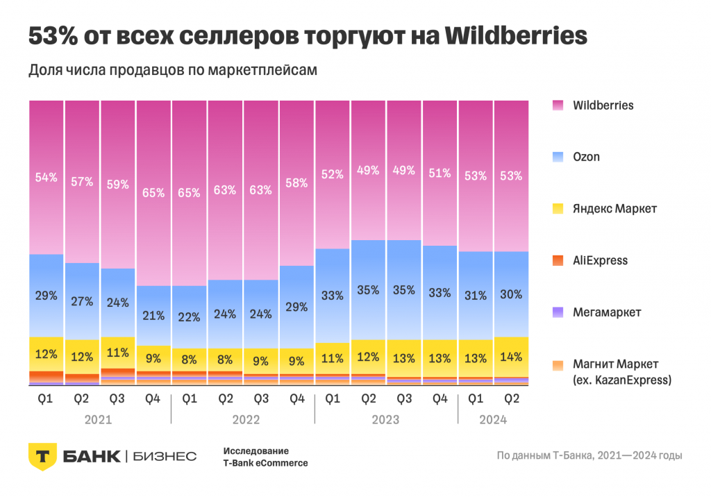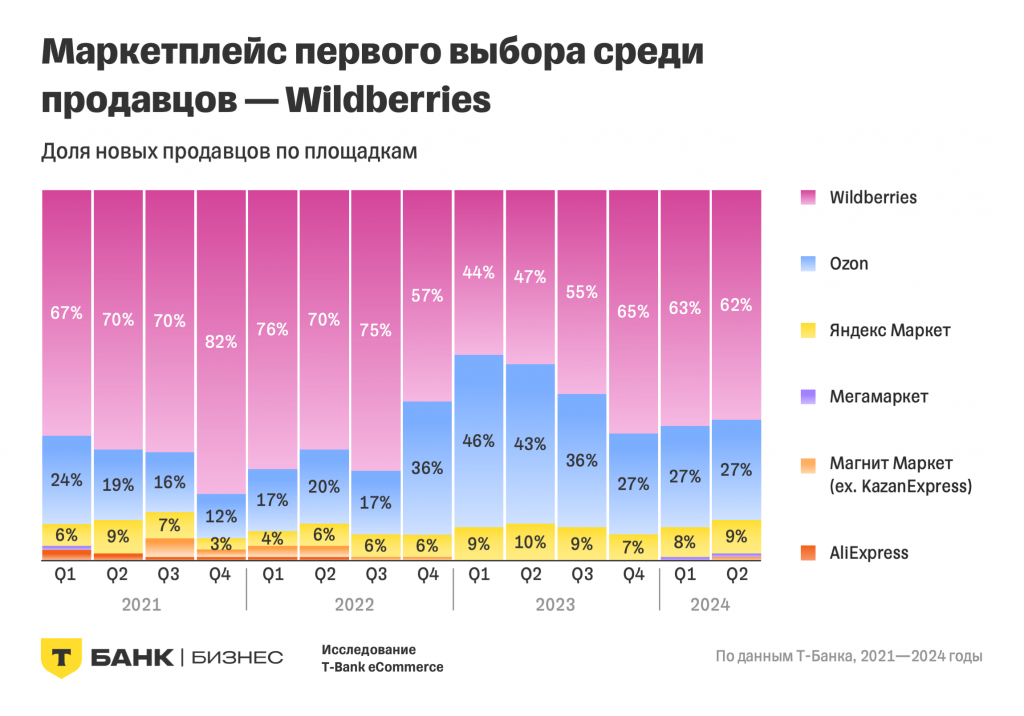 Платформа T-Bank eCommerce опубликовала результаты третьего ежегодного исследования, посвященного динамике покупок и доходов продавцов на маркетплейсах России. В исследование вошли данные за период с 2020 года по первое полугодие 2024 года, собранные на шести крупнейших торговых площадках: Wildberries, Ozon, Яндекс Маркет, Магнит Маркет (ранее KazanExpress), Мегамаркет и AliExpress.