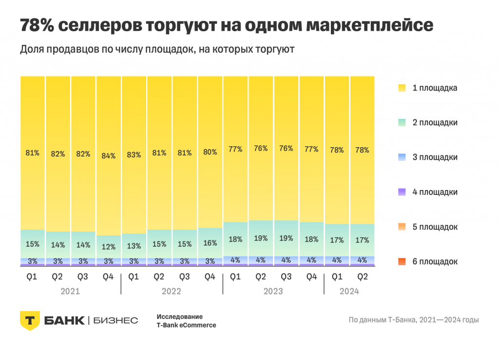 Большинство продавцов (78%), как и в прошлом году, ведут торговлю на одной площадке. Доля торгующих на двух площадках во втором квартале 2024 снизилась по сравнению с аналогичным периодом прошлого года почти на 2 п. п. Доля тех, кто представлен на трех и более площадках, по сравнению с 2023 не изменилась.