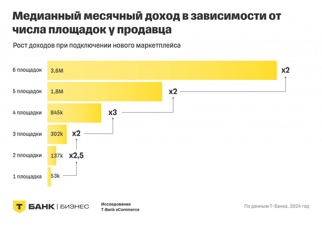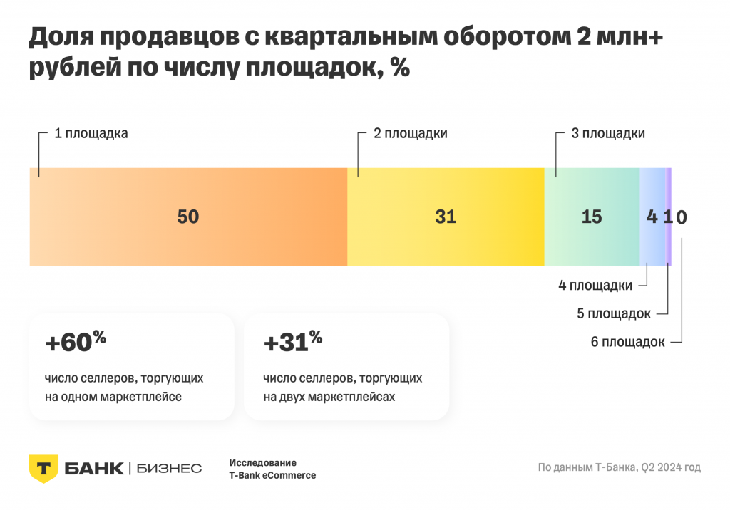Если говорить о продавцах с квартальным оборотом более 2 млн рублей, половина из них торгуют на двух и более площадках. За год число таких продавцов, работающих с одним маркетплейсом, выросло на 60%, а с двумя и более — на 31%.