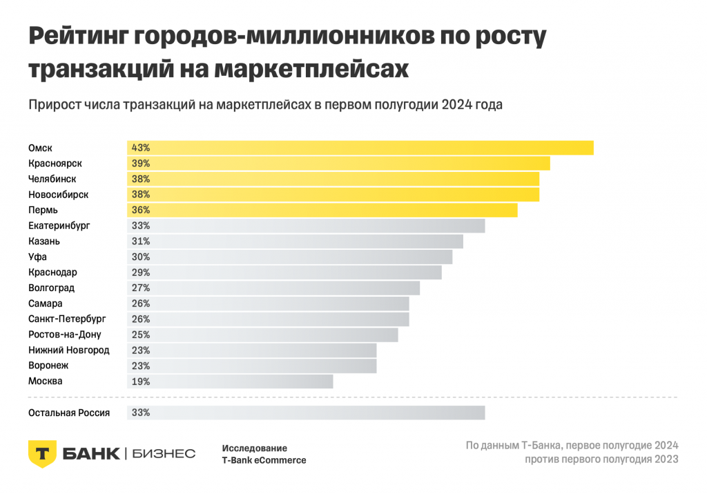 Рост числа транзакций и оборотов на маркетплейсах в первом полугодии 2024 года демонстрируют города-миллионники. Лидерами стали Омск, где число транзакций выросло на 43%, а обороты увеличились на 62%, Красноярск (+39% по транзакциям, +56% по оборотам) и Челябинск (+38% и +56% соответственно). Более умеренный рост показала Москва — всего 19% по числу транзакций и 29% по оборотам.