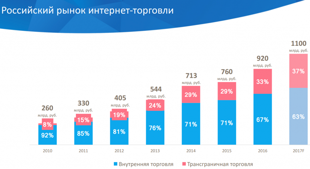 Пока еще импульс для роста дает трансграничный сегмент. По итогам 2017 года, по данным АКИТ, доля трансграничной торговли в обороте интернет-ритейла вырастет с 33% годом ранее до 37%, или 410 млрд рублей.