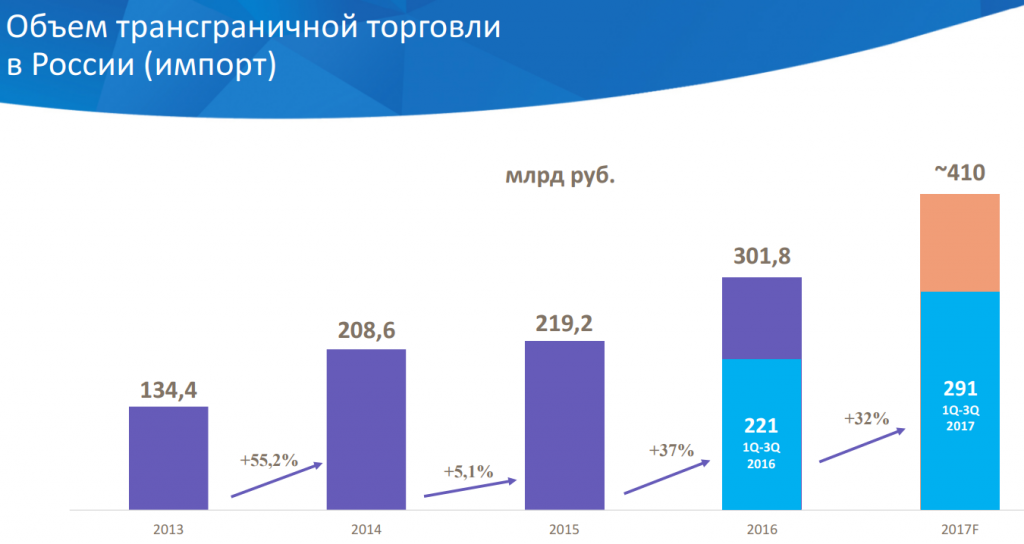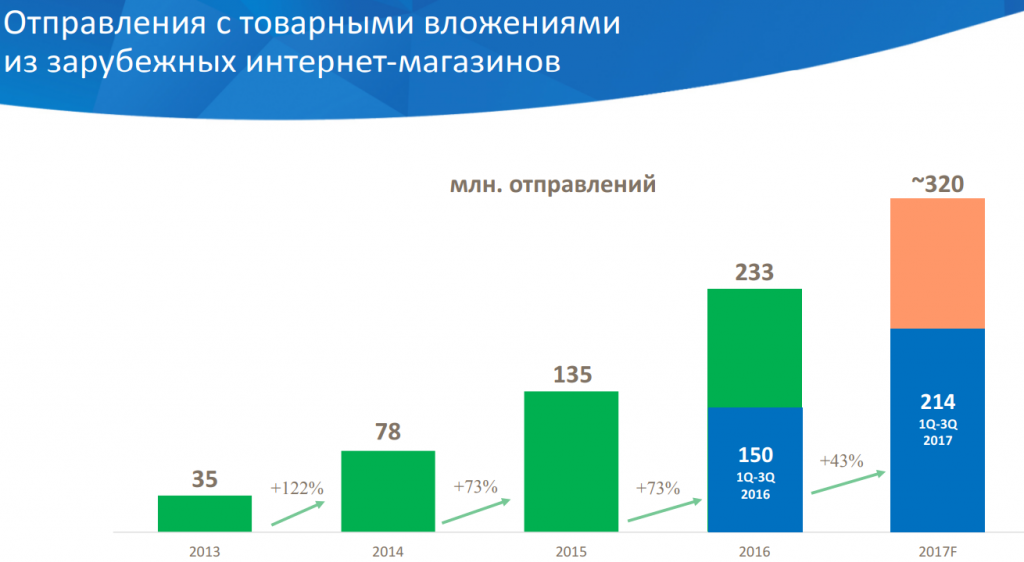 За январь-сентябрь 2017 года количество входящих международных отправлений увеличилось на 43%, до 214 млн штук (заказы на внутреннем рынке выросли только на 9%).
