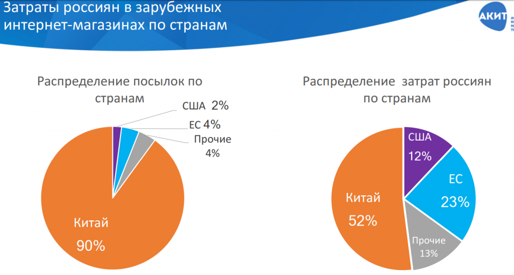 Традиционно самый большой объем товаров приходит к нам из Китая: доля отправлений из этой страны составляет 90%. Для сравнения: из ЕС идет всего 4%, из США - 2%. В денежном выражении на товары из Китая приходится 52%, ЕС - 23%, США - 12%. При этом более 64% покупок в зарубежных магазинах не превышают по сумме €22, более 96% не превышают €150.